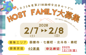 日本の大学・専門学校・日本語学校に通っている留学生のためのプログラムです。北海道の家庭にホームステイをしながら、日本文化体験/地域交流/学校交流/北海道ならではの体験ができます。夏と冬に開催していますので、日本の家庭や生活に興味のある人は、ぜひ参加してください。